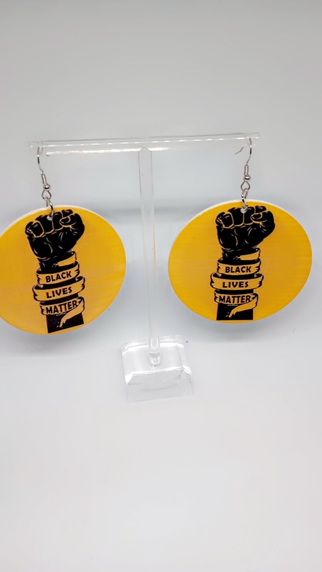 Circular wooden earrings with black fist wrapped in Black Lives Matter yellow ribbon