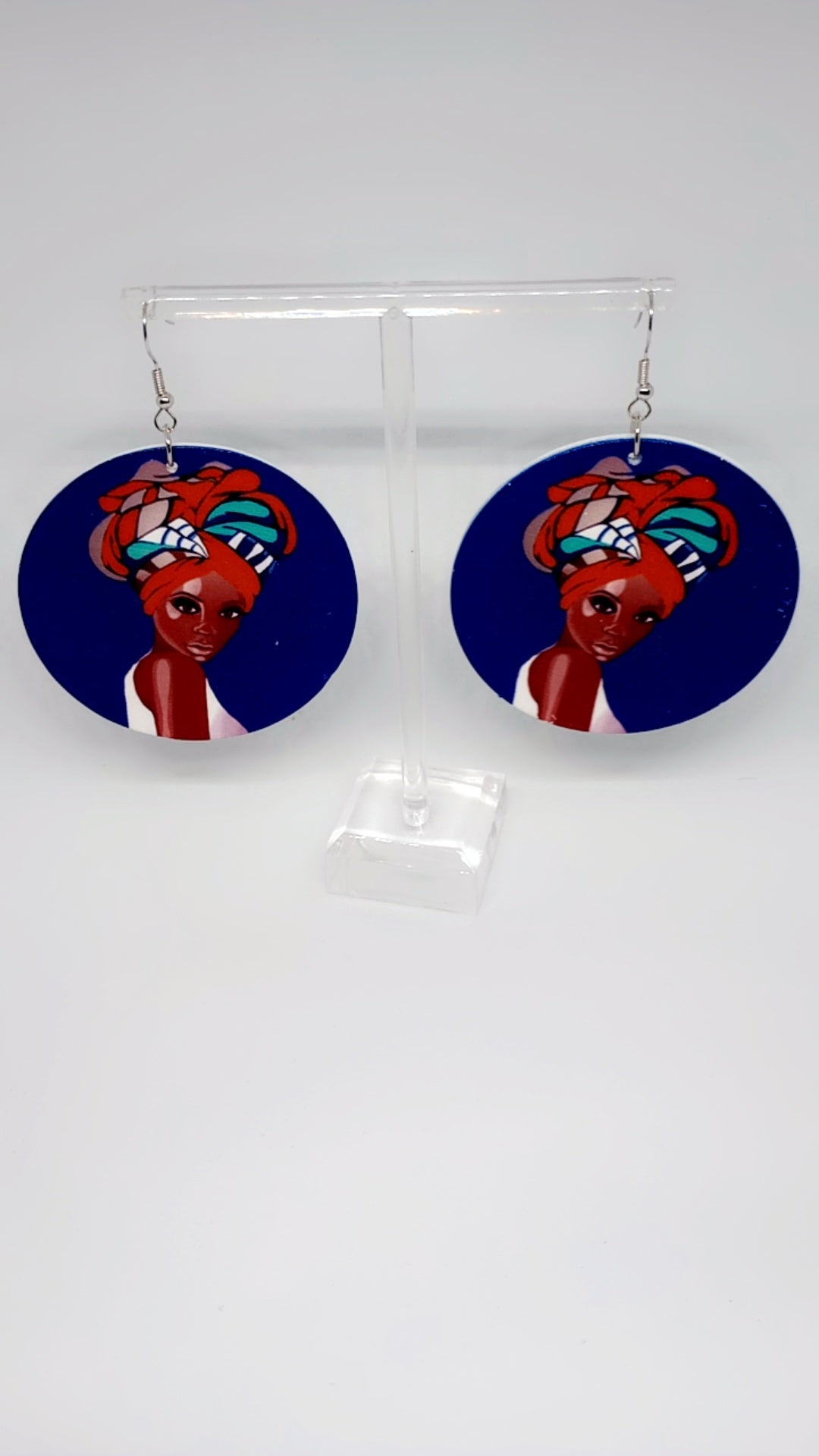 Circular wooden earrings with a woman wearing multi-pattern head scarf