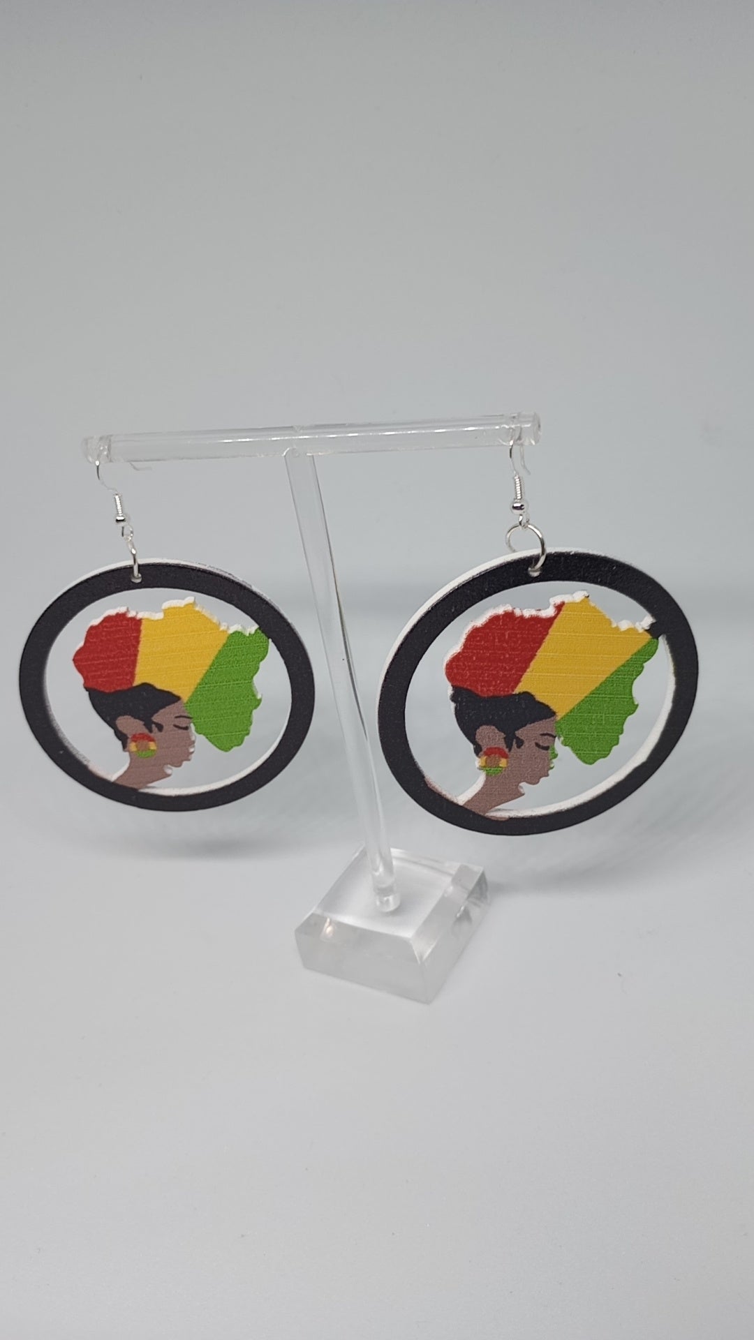 Wooden circular earrings with Black woman sporting Juneteenth flag as hair