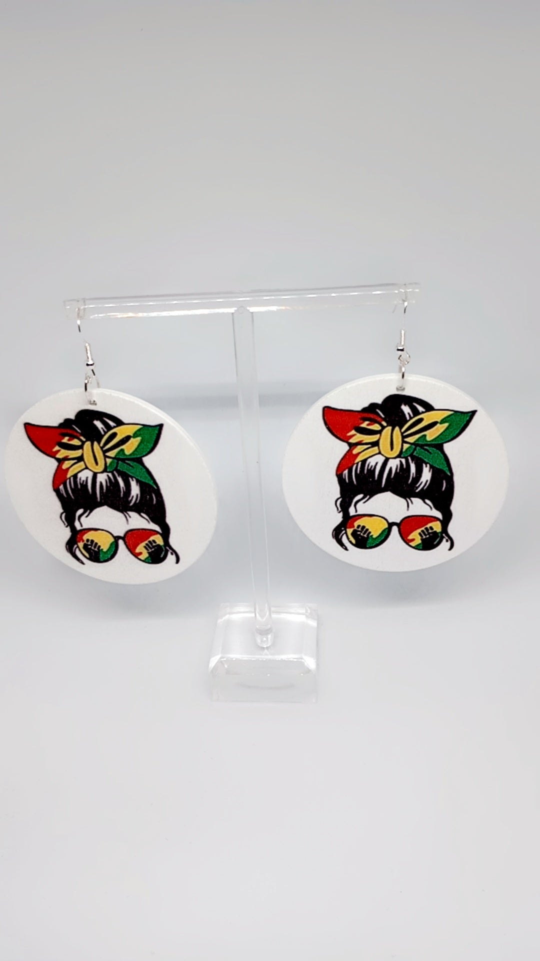 Circular wooden earrings with young women wearing red, yellow, and green.